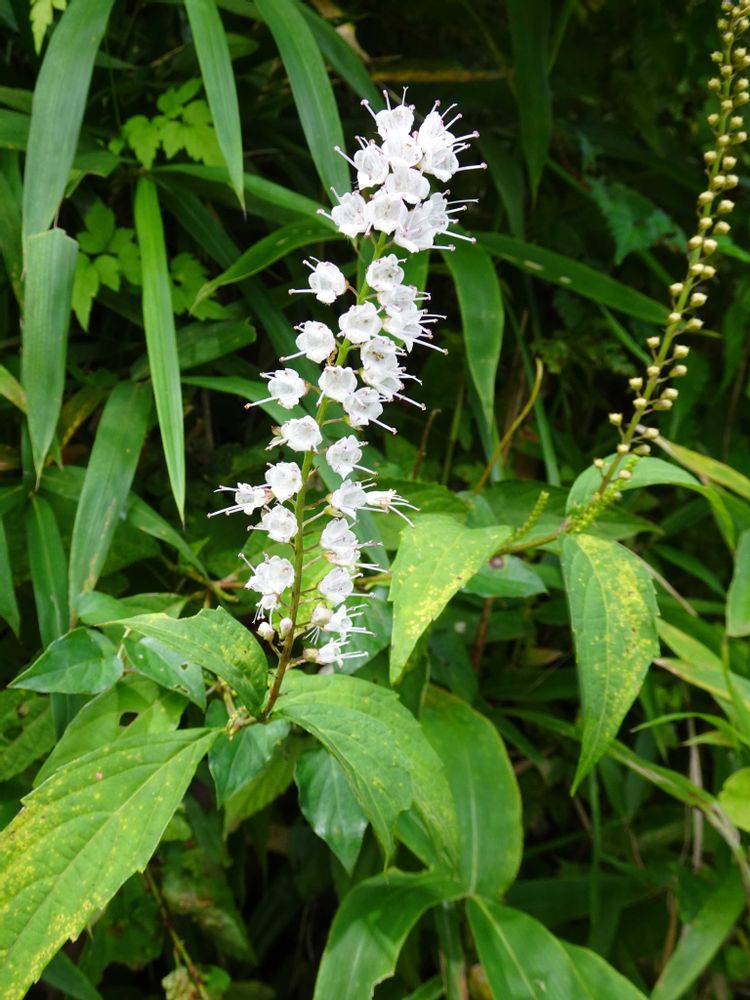 秋に白い穂状の花④を咲かせ、冬には冷え込みの強い時にシモバシラの霜華(氷の花)を咲かせます①②③
