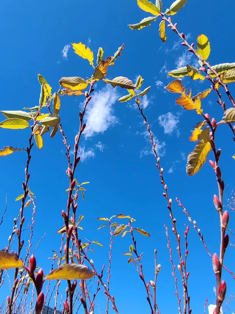 いち早く柳の木を見つけました😊別名の赤芽柳の名前の方が良いようです♪︎♪︎♪︎♡♡ 青空にポカリと白い雲がバランス良くパシャリ🤳