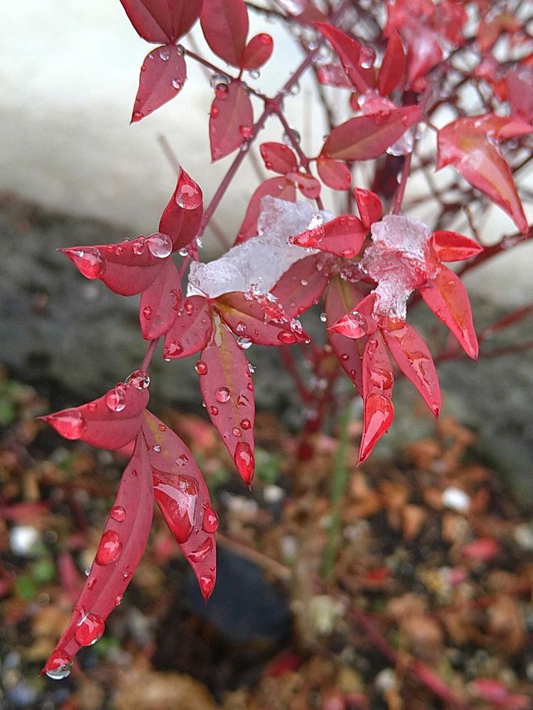 水滴や雪をまとった南天の葉が素敵です✨