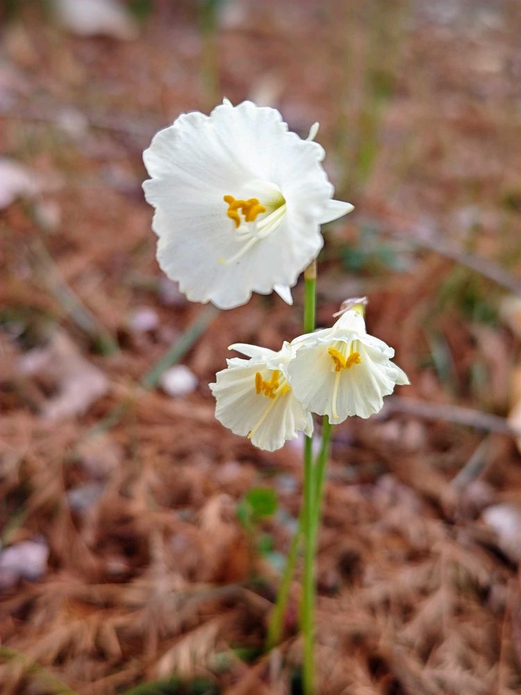 服部緑地都市緑化植物園、ラクウショウの落ち葉で埋まる中から、ペチコート咲きの原種系スイセン、モノフィラス📛が小さな花を咲かせてました。