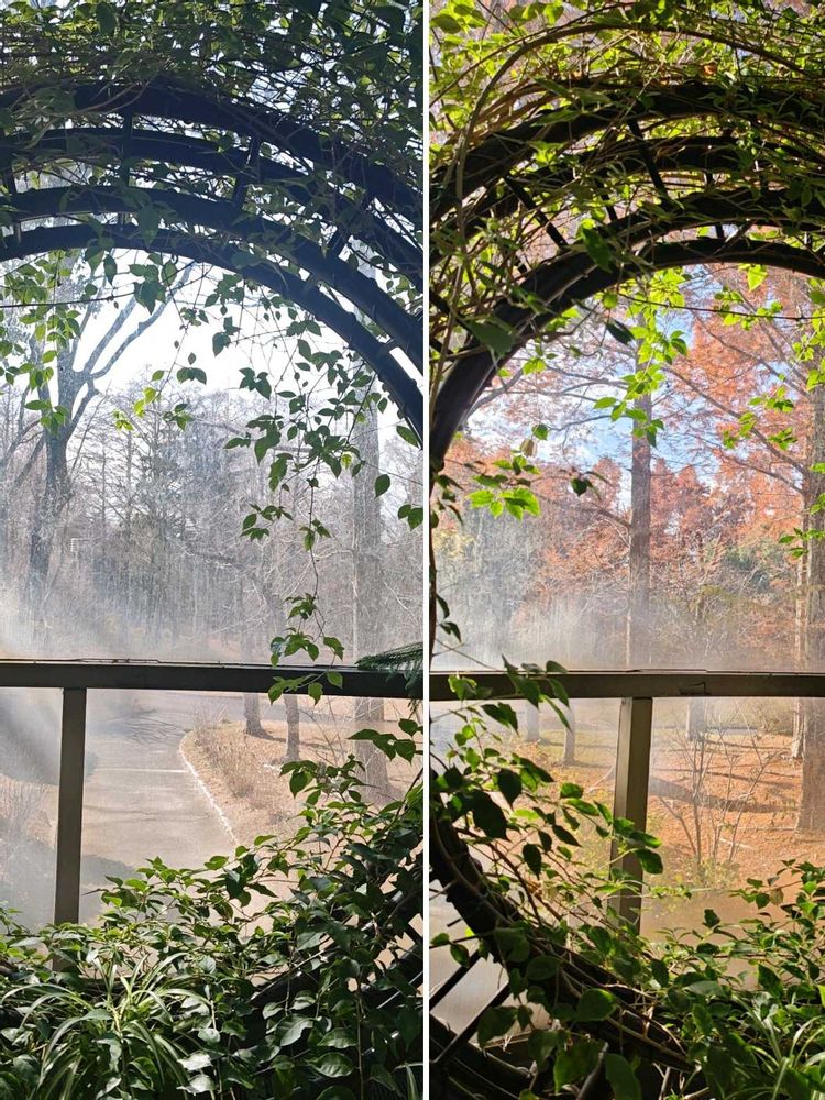 5枚めは、温室の丸窓から見える景色。➡️が2024/12/16。⬅️が昨日2025/2/7。ラクウショウ他の葉っぱはすっかり落葉🍂して、裸木が立ち並んでいました。