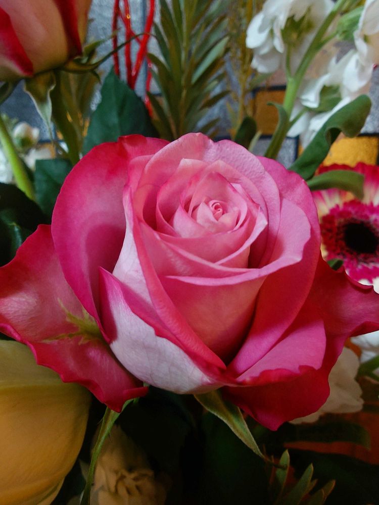 いつも行く、朝市で見つけたバラ🌹の色合いが、とても気に入り、ガーベラと合わせました🎵