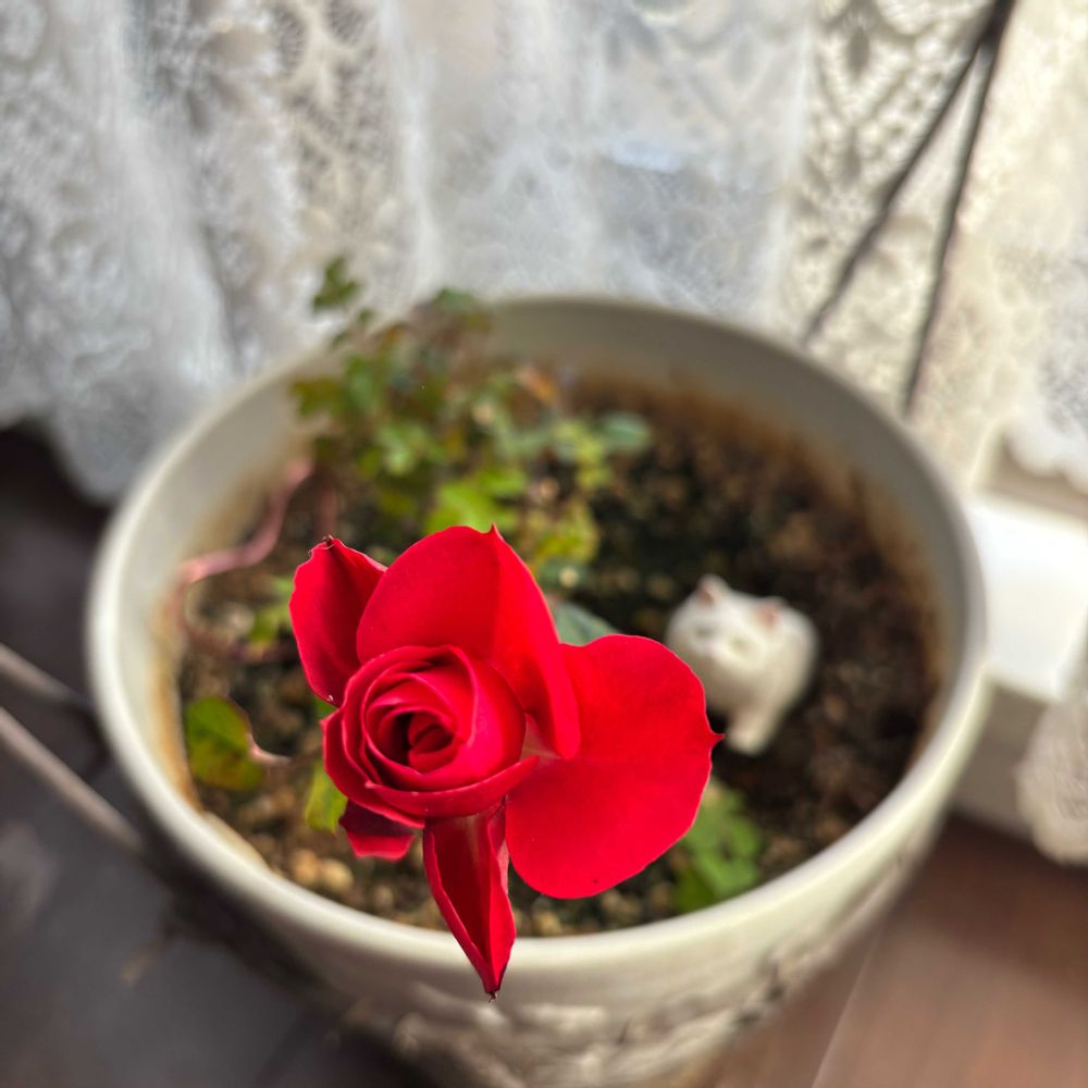 ②朝晩だけ家の中に入れてる真っ赤なミニ薔薇さん開花してます🌹