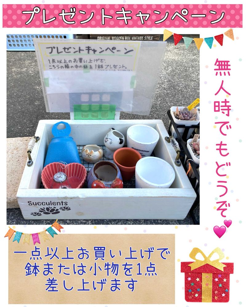 当店の商品を、一点以上お買い上げのお客様に、鉢や小物などを1点プレゼントします。