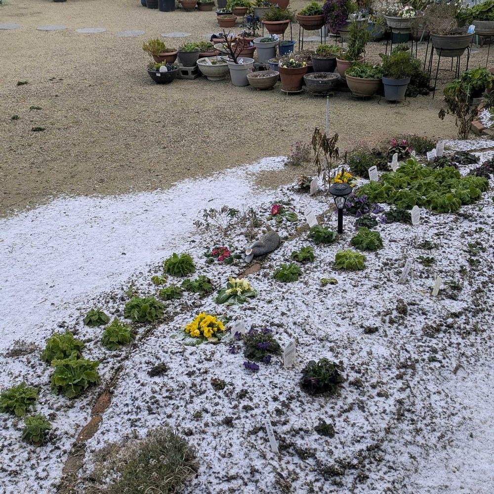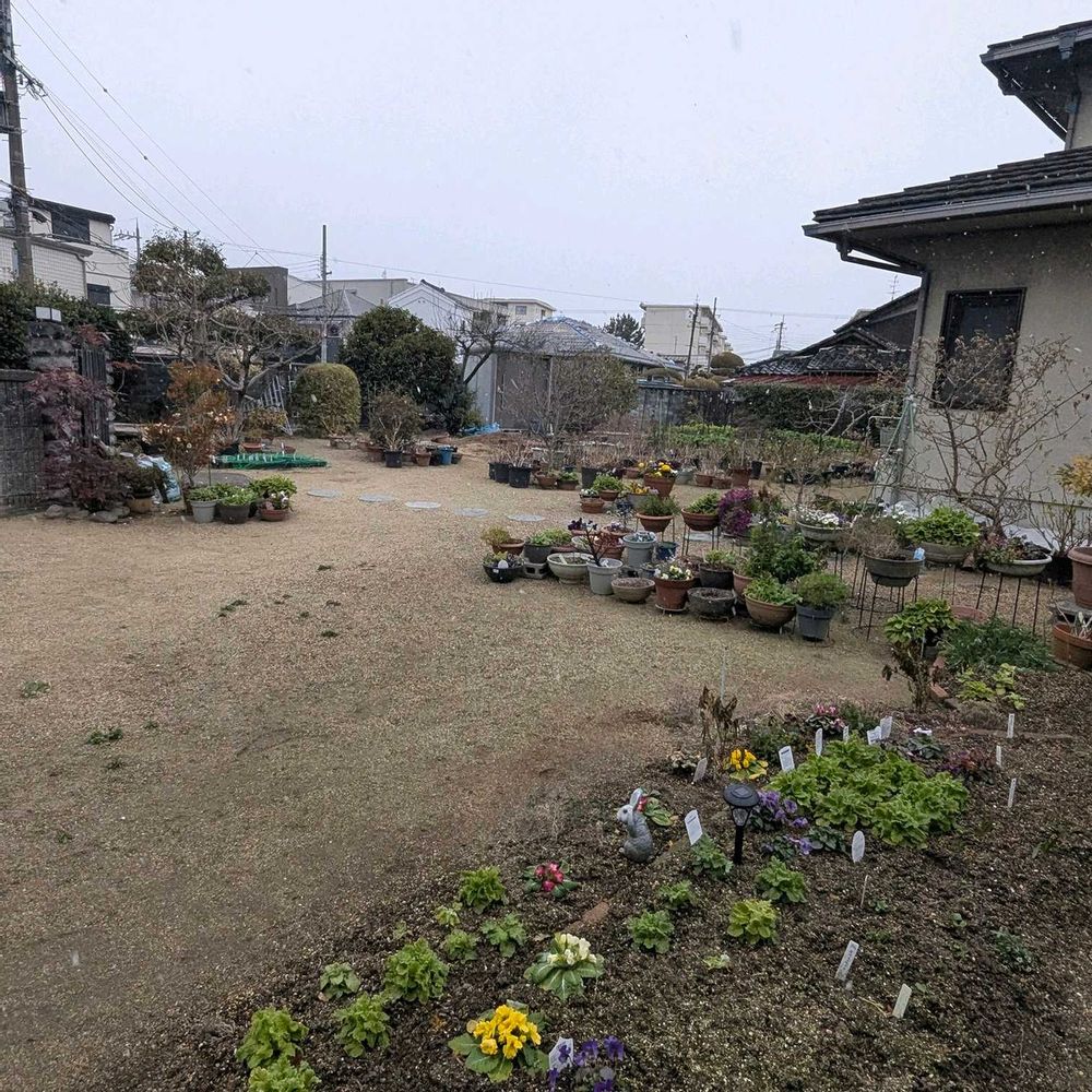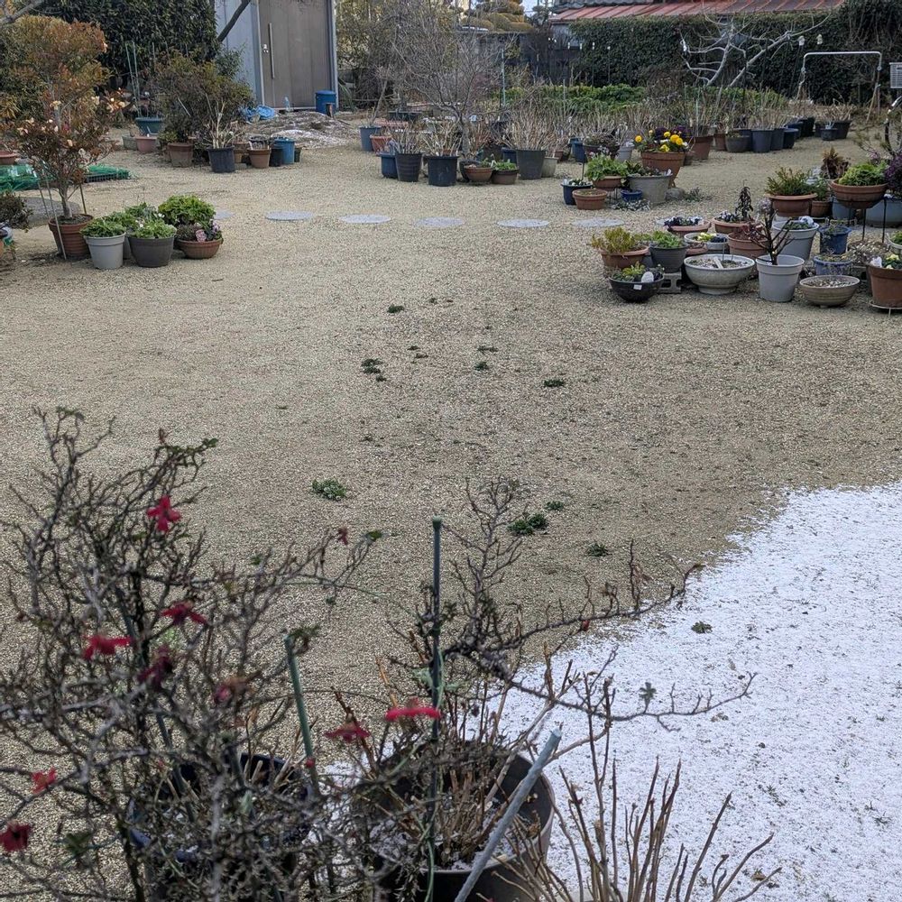 朝起きると 花壇に少し積もっていて、今も そのままです❄️