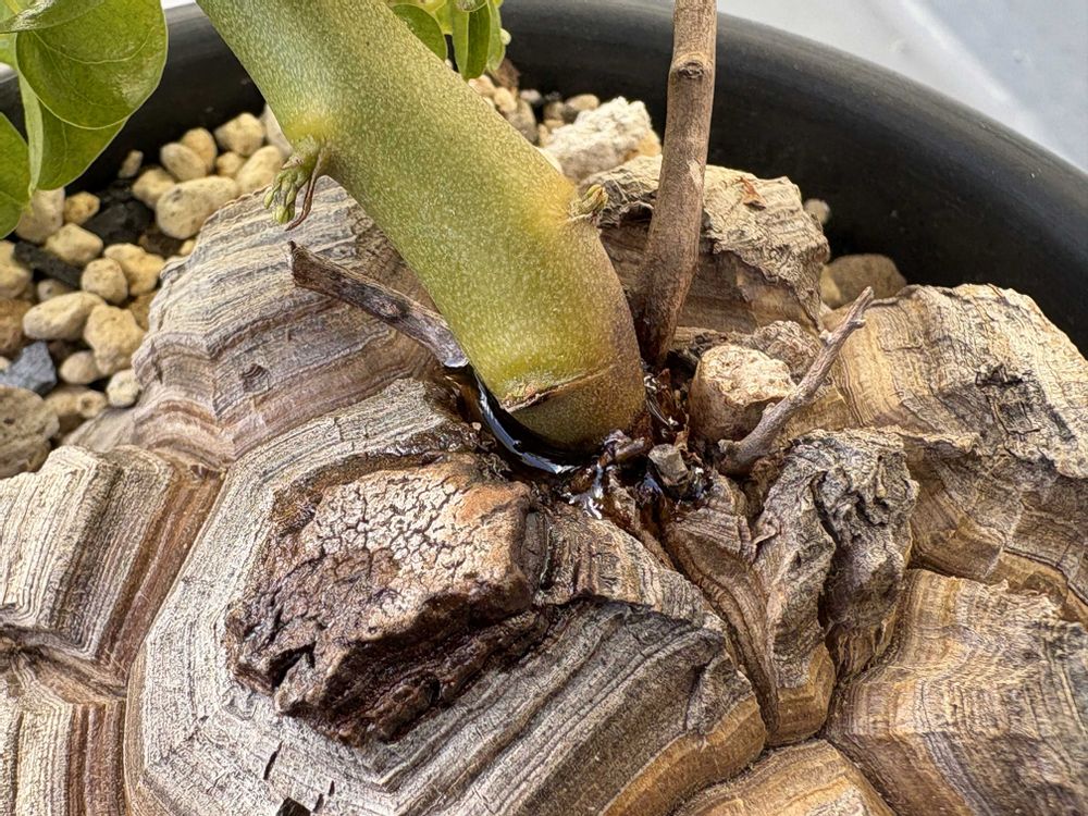 昨晩の強風のせいか、ツルの根本がグラグラ。汁が出ていました。