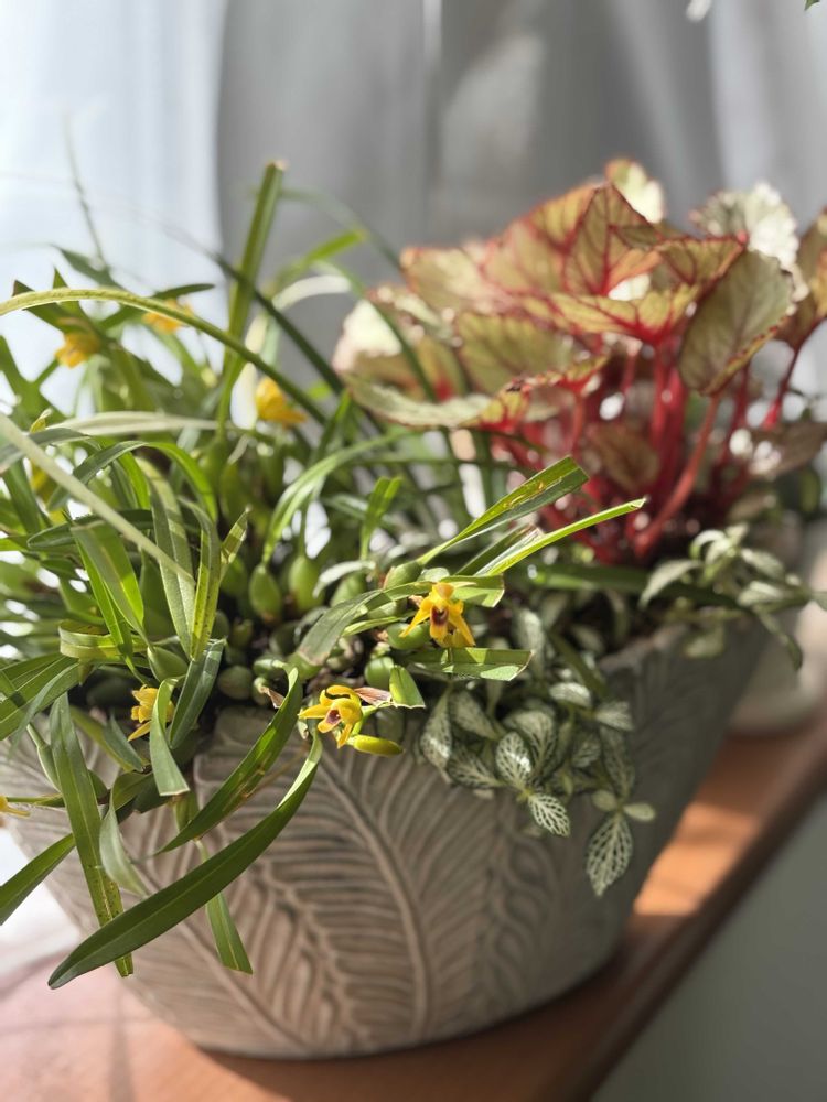 鉢底穴のない容器に#ベラボン で植えた観葉と#マキシラリアバリアビリスナナ 育て初めて5年目 今年は花つきが良くて嬉しい〜