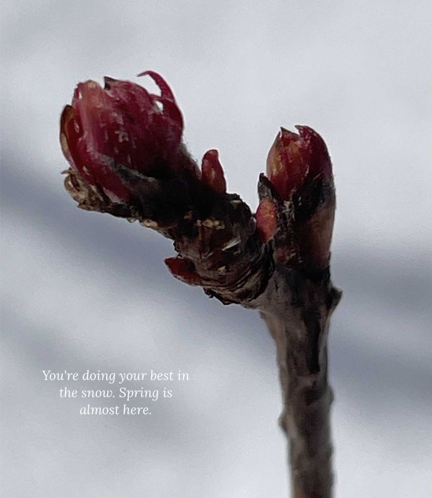 雪の中で赤い冬芽が鮮やかです。が、周りの雪の逆光で少し暗い写真になってしまいました😅