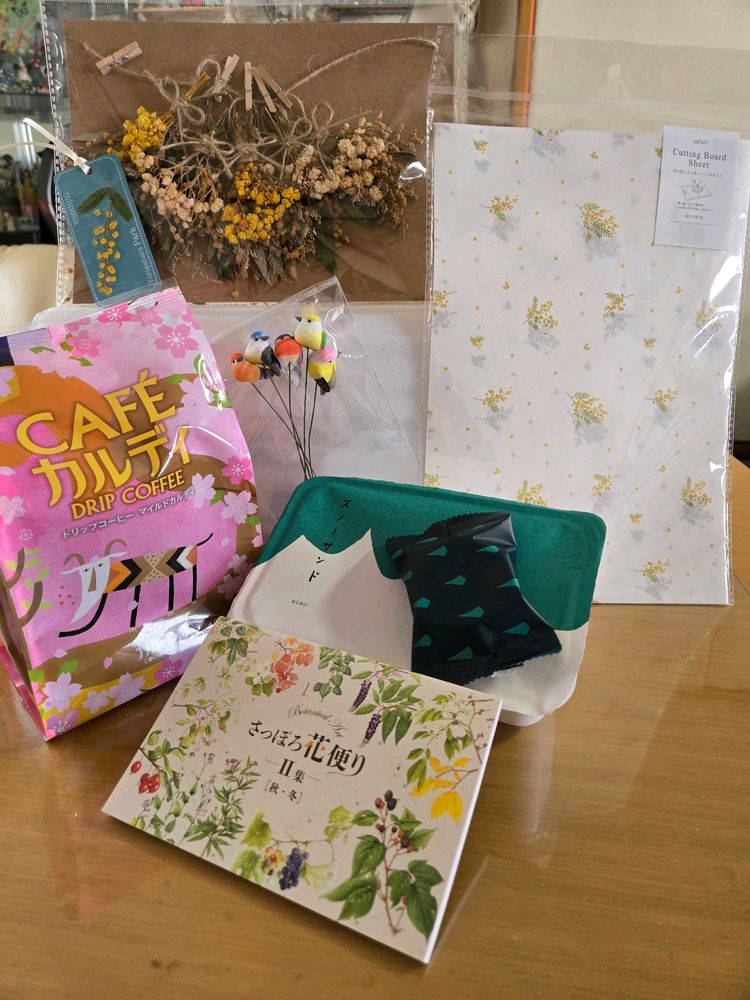 ミモザのドライフラワー・ミモザの栞・🐦鳥さんピック・コーヒー☕・お花の一筆箋・汚れ防止まな板シート(綺麗すぎて使えない🤭) そしてお手紙💌