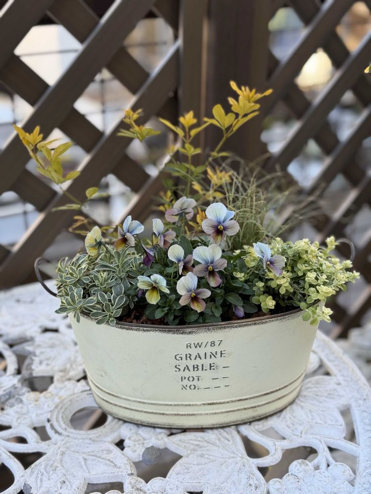 素焼きや陶器の鉢は重いのでいつもプラ鉢ばかりでしたがブリキ鉢は軽くて可愛いのありましたので使いました❣️