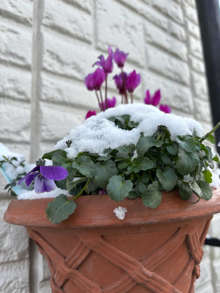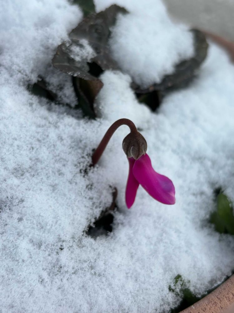 ガーデンシクラメンちゃんのひょっこり かわいいけど 寒いね寒いねって 毛布で包んであげたくなっちゃう