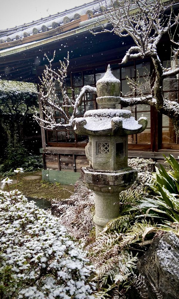 サザンカも蕾つけ始めた白梅も灯篭も雪化粧❄︎