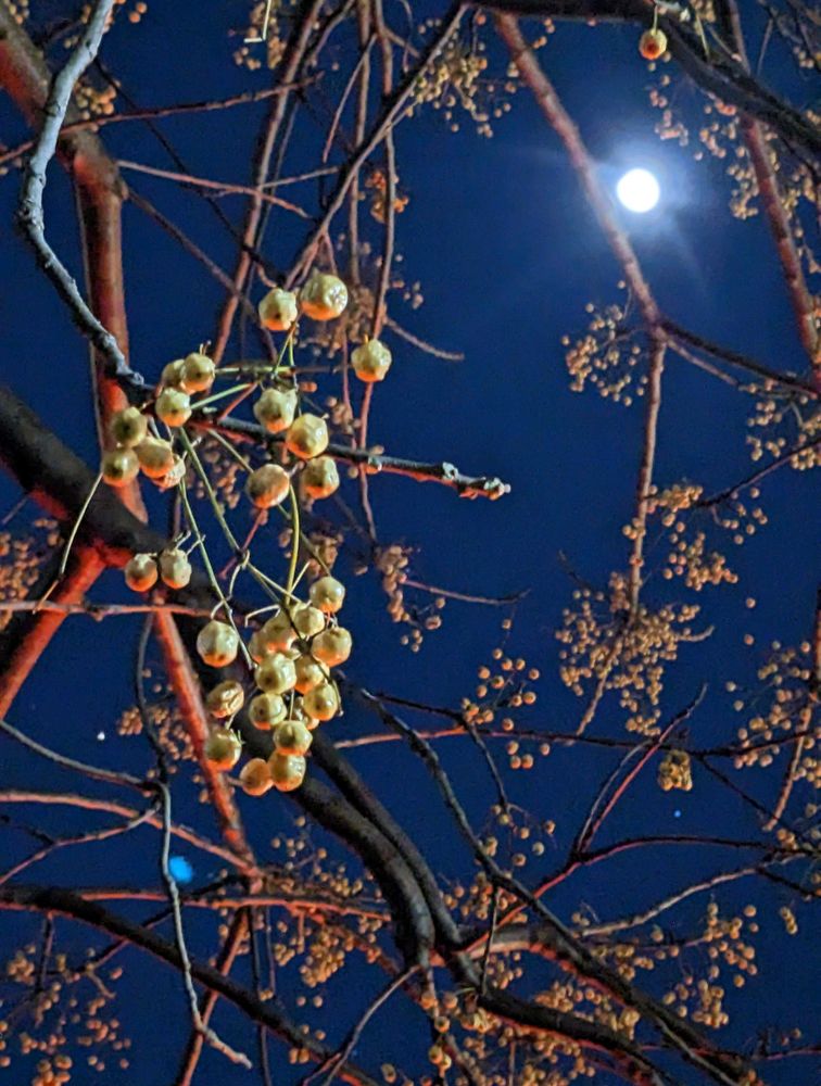 昨晩、センダンの木の前を通りかかった時、月が真上に見えました。