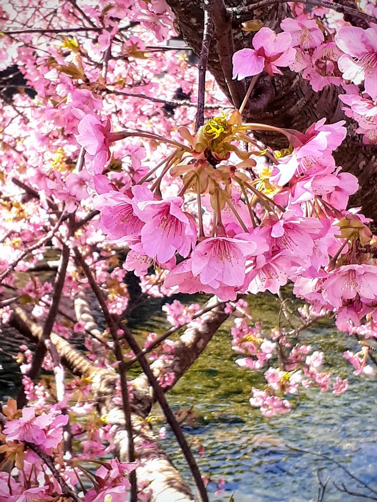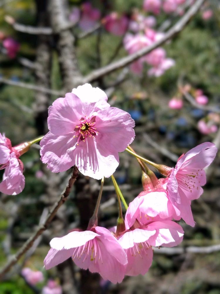 桜の開花時期がもう少し早いと河津桜の良さが表現できるとおもいます。雄蕊・花弁が赤身を帯びて開花して時間が経過している事を表しています。