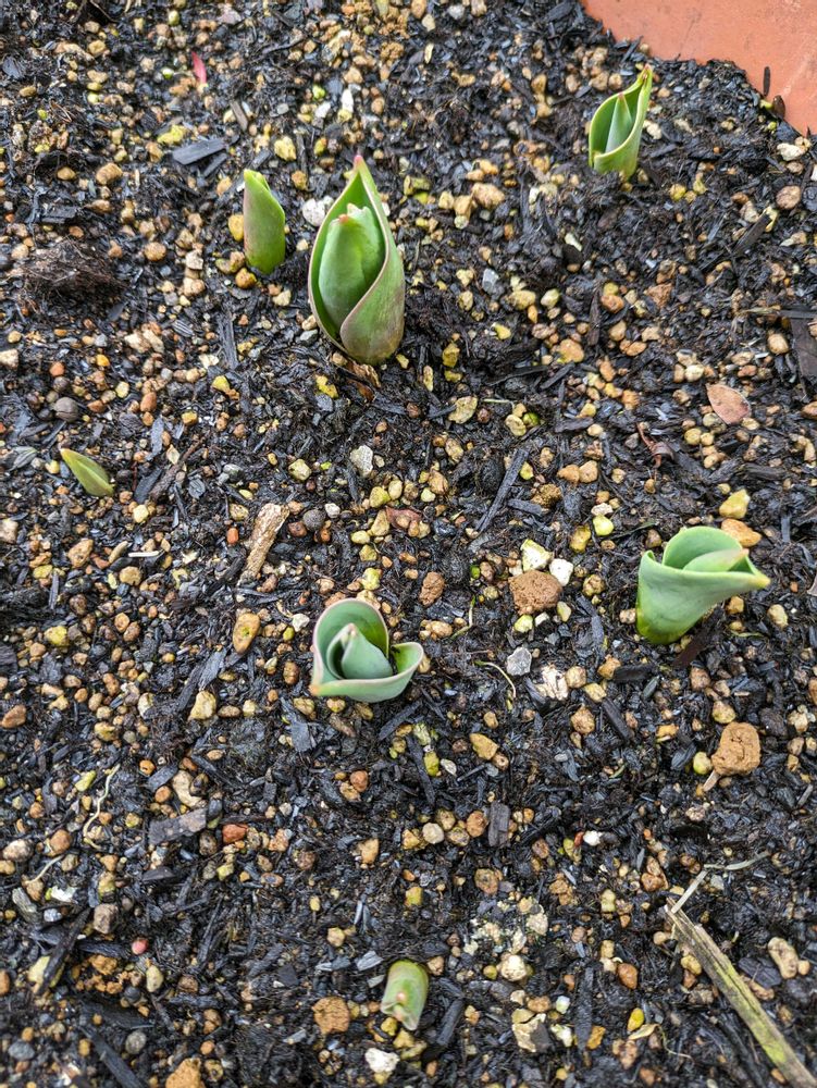 あらぁ、チューリップ今で7個ニョキっとかわいい芽出しがあるのね〜😍🌱👍✨