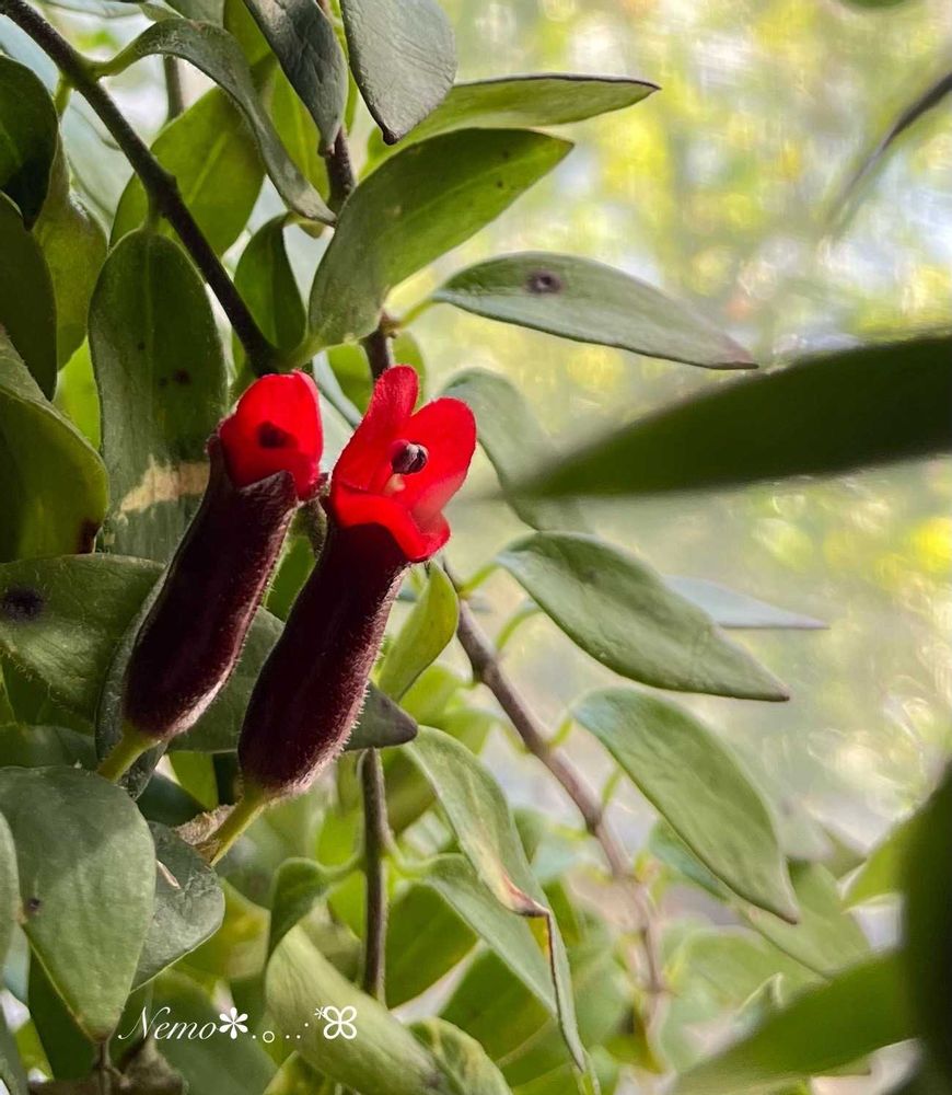 エスキナンサスのお花は、赤黒い鞘から真っ赤なお花がニョキッと出てきます1つの花は咲いてますが2つ並んでるのはこれから鞘より長く出てきます❣️