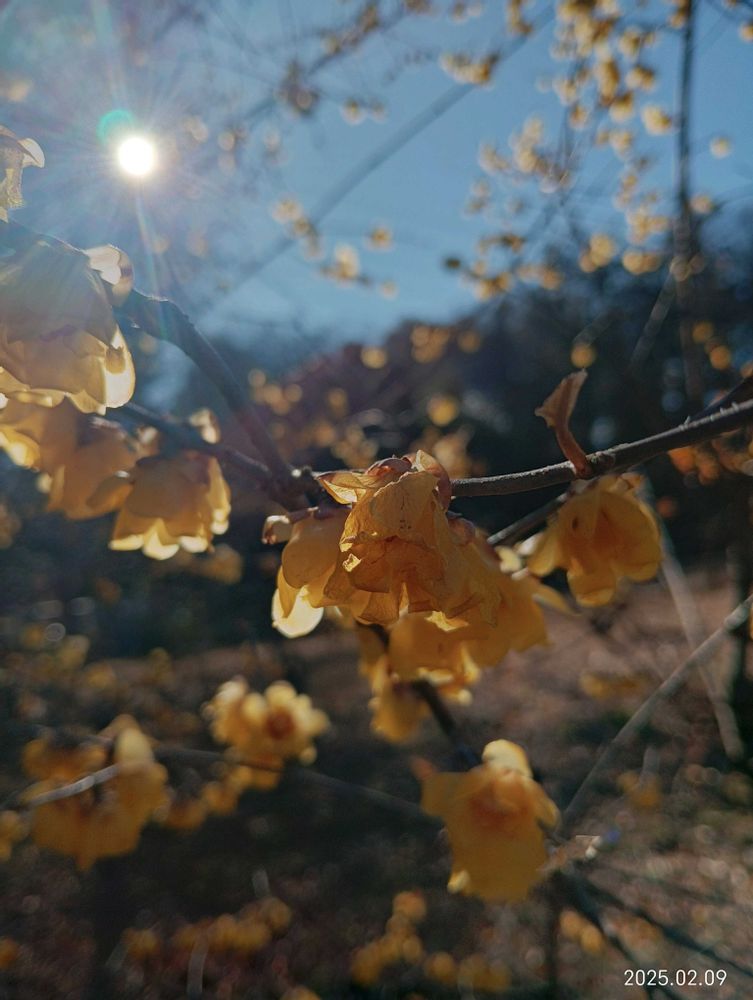 青空に太陽の光に浴びての蝋梅が美しいです~✨✨💛💛💛💙