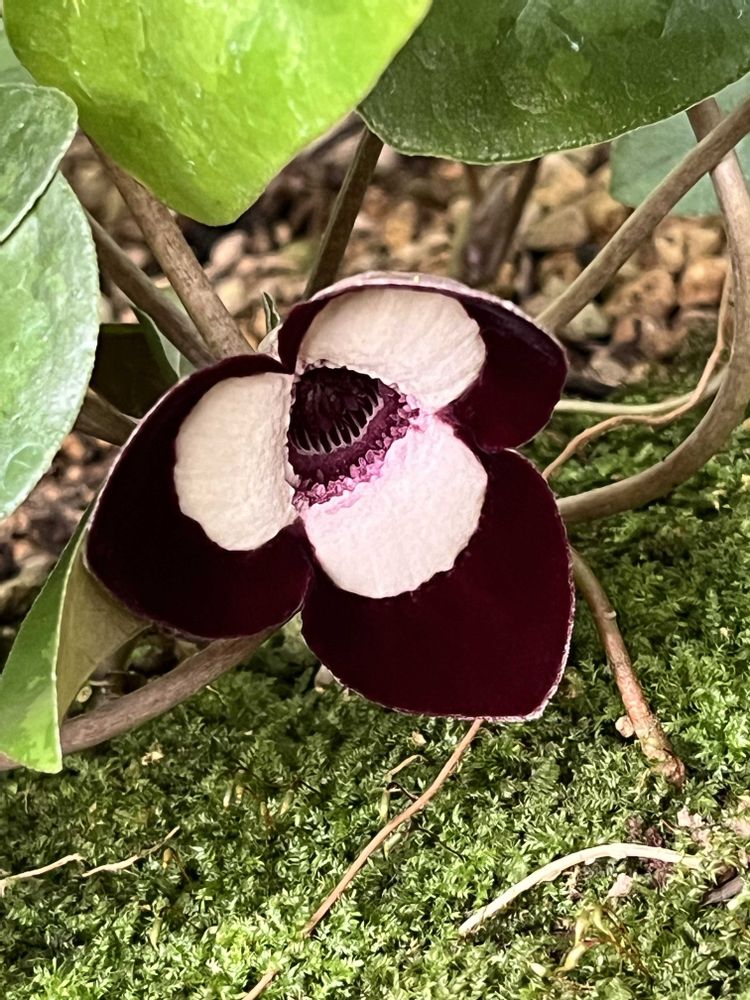 中国原産のウマノスズクサ科の多年草で、白と黒のビロード質の萼筒がパンダの顔🐼のように見える「パンダカンアオイ」、可愛い😍ですよネェ〜😘