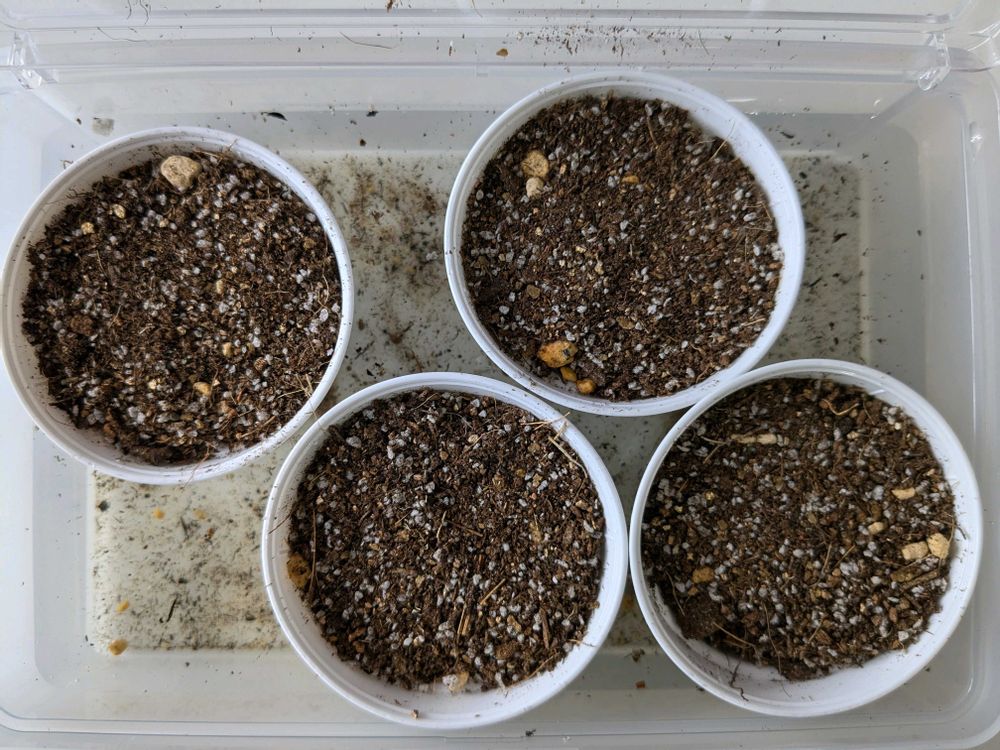 です。上2つはケーレス、下2つはサクレンシアの種です。今室温/湿度は20℃/60%です。お日様さえ出てくれれば😝来週の寒波までに発芽してくれれば!