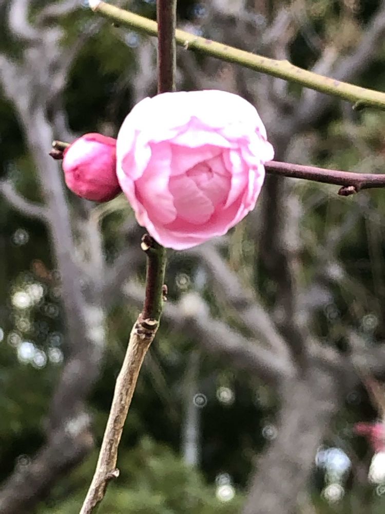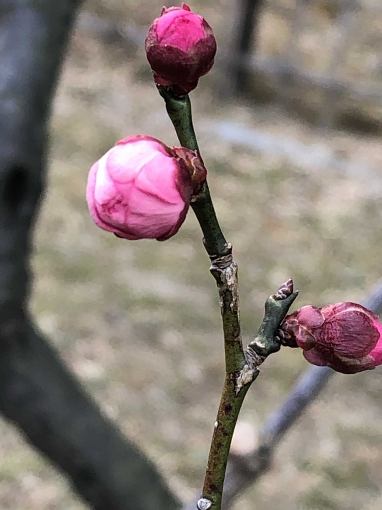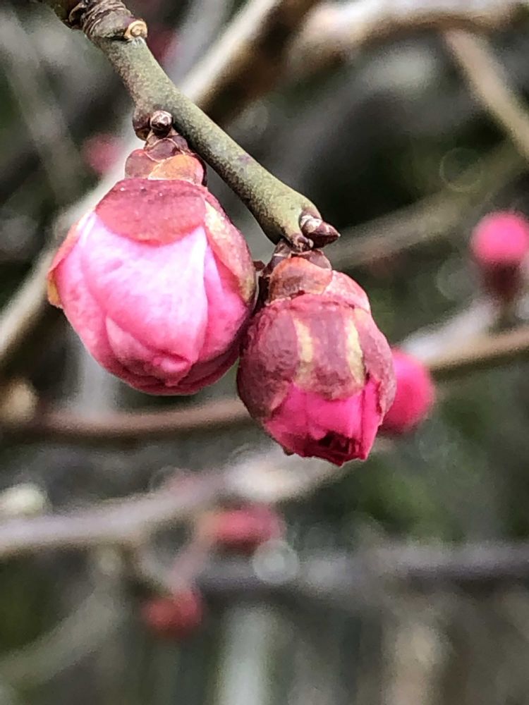 紅色のウメ「八重寒紅」の蕾も膨らみ開花までもう少しです。📸🌸🤫😄🌞💦
