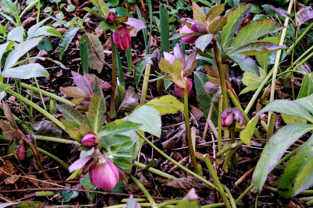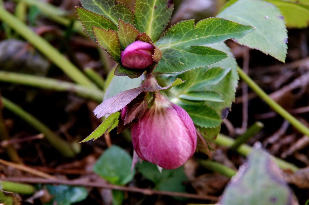 サルスベリの下で、冬の寒さに耐えて葉をつけていたクリスマスローズ