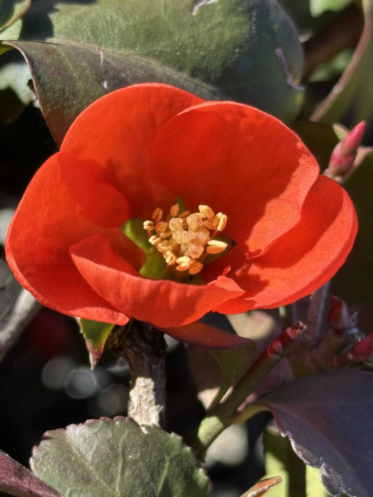 Chaenomeles japonica/Chaenomeles. Rosaceae. Rosales. Magnoliopsida. Tracheophyta Commonly called/Japanese quince Native to/Japan Symbolism/Prosperity. Re-silence. Luck. Transient beauty *Genus of 3 species of deciduous *It is a piguant fragrance with aspects of “rhubarb” passion fruit. *Mid green leaves, to 2in(5cm)long. *Abundant clusters of orange to red flowers, 1 1/2in(4cm)across Photographed 2/9 10:13am 2025 Posted 2/10(Monday) 12:17pm 2025