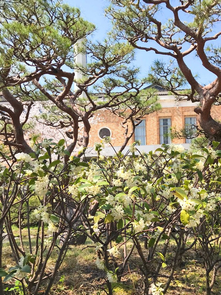 青い空💙にグリーン💚に白い沈丁花🤍レトロなレンガ🧱の美術館ପ(꒪ˊ꒳ˋ꒪)ଓ。ෆ。