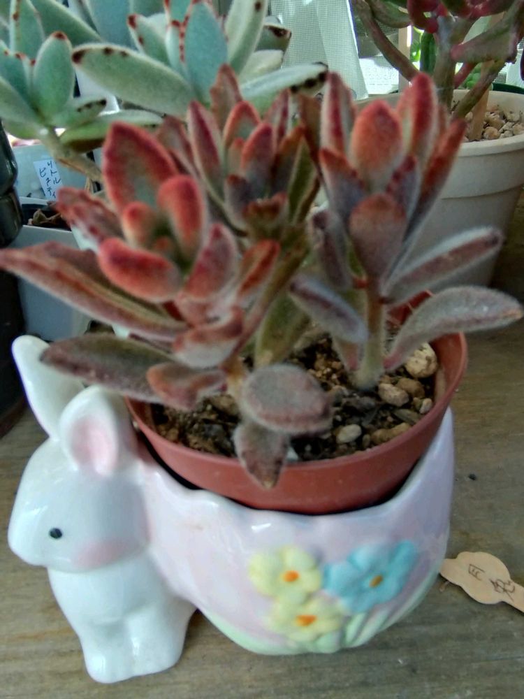 鉢縁の🐰さん今日私もベランダに落としたけれど大丈夫でした(ラッキー)鉢縁猫😸さんもいますよ、