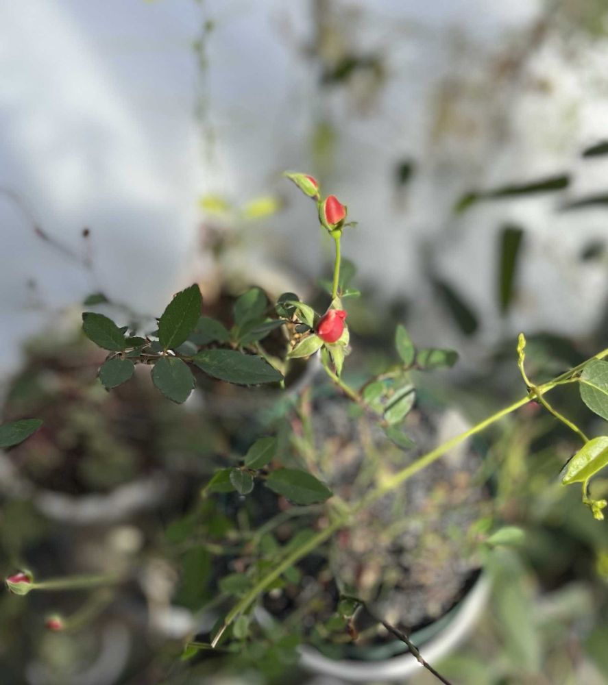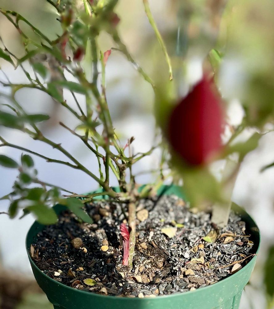 まだ、雪が残っていて庭には踏み入る事ができません。サンルームでミニバラモカだけが剪定待ちでつぼみを残しています。黒星の葉っぱを取っていたら、根元から赤いシュートが出てきていました🥰