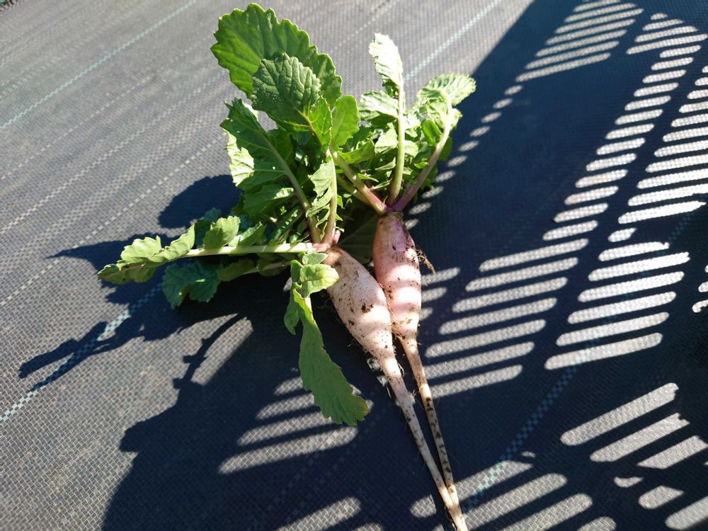 久しぶりの畑作業でした🥦ブロッコリーの収穫とミニ大根の間引きをしました。写真は間引き菜です。十分食べられる大きさだったのでみそ汁にしました。