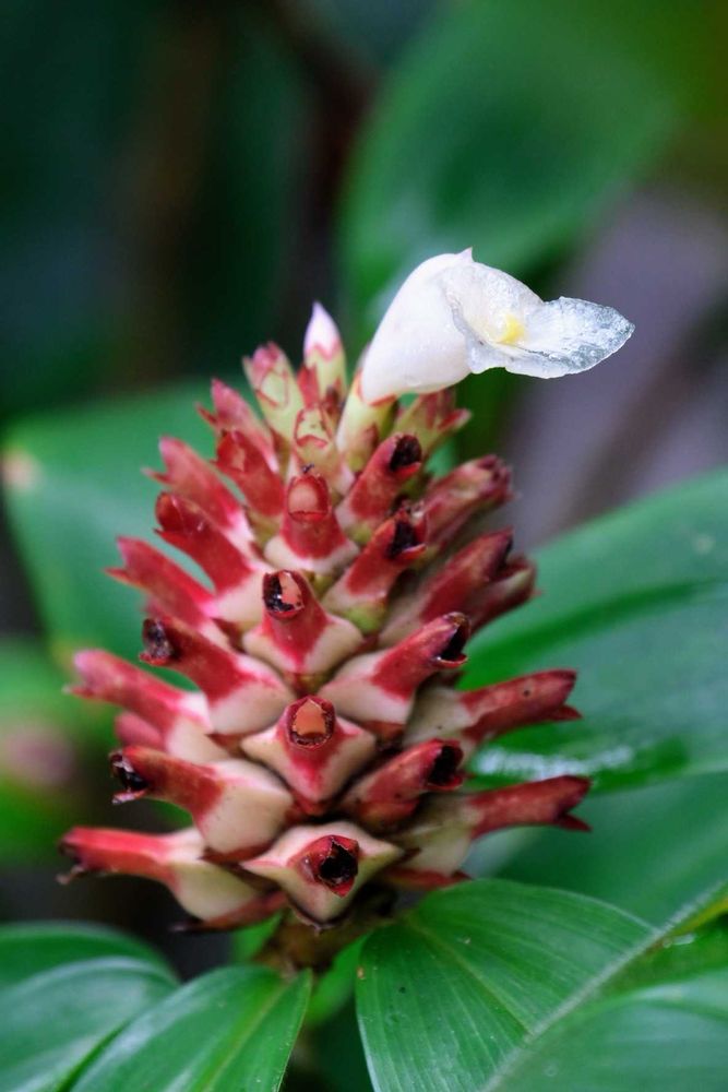 イソギンチャクみたいな不思議な形の植物はコスタス(オオホザキアヤメ)です。白い花が咲いています。