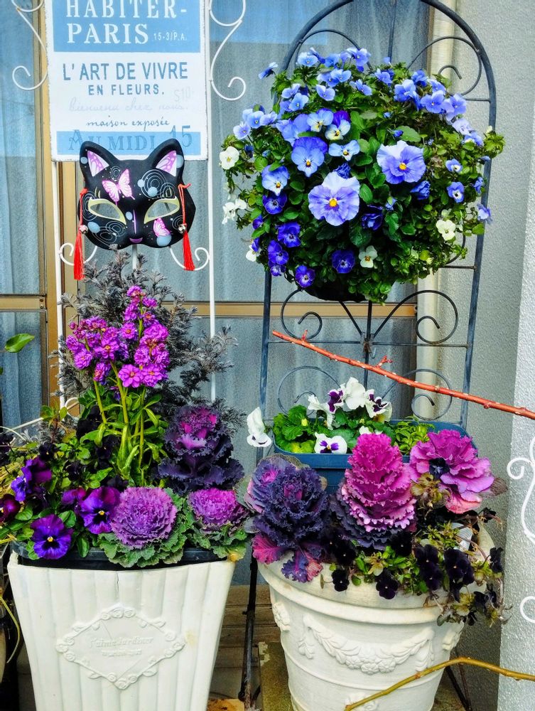 白、青、水色の寒色系でまとめたハンキングと紫でまとめた寄植え達🪴