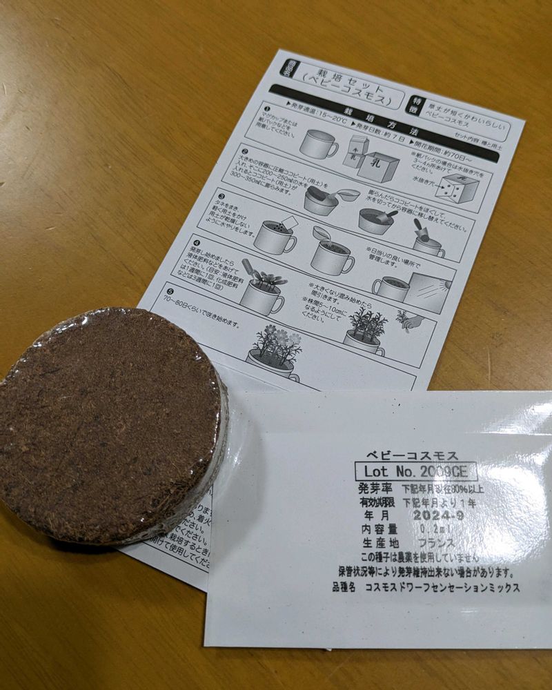 まだまけないけど、付属の ココピートに水をかけ、牛乳パックやペットボトル等の底に穴を開けた中に入れて、種を蒔くだけ。
