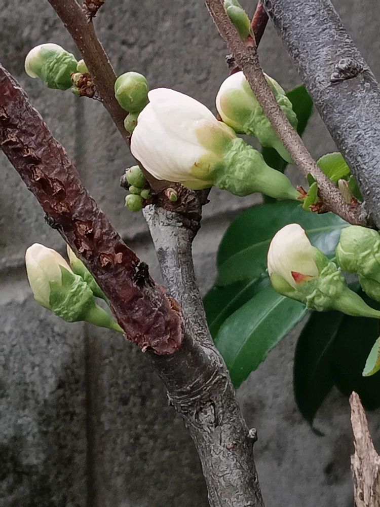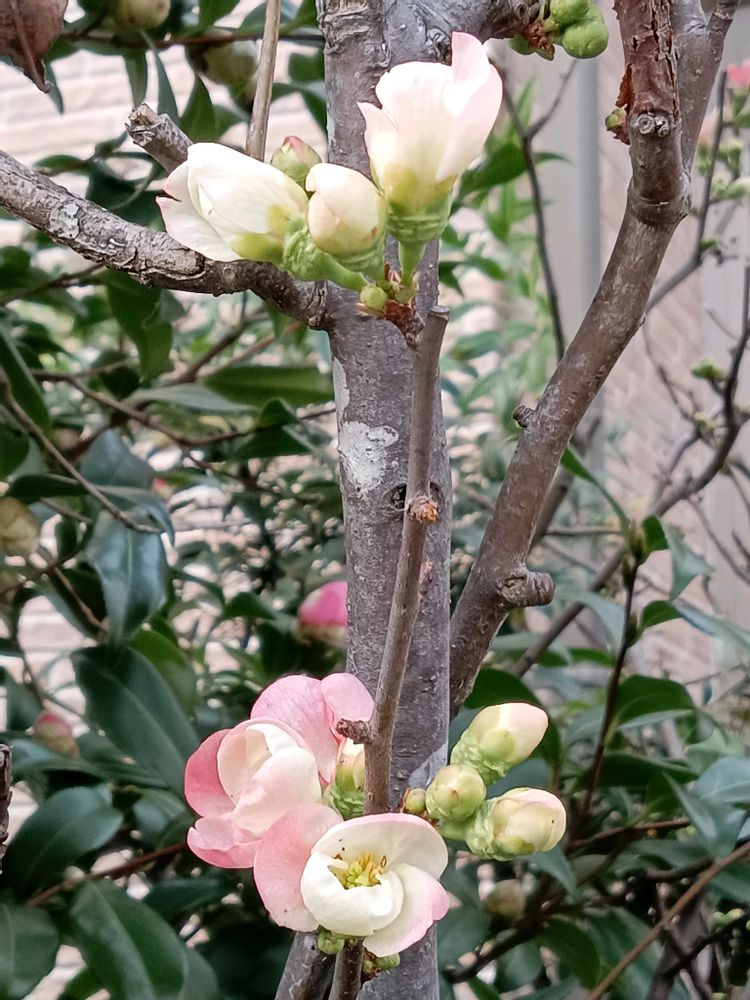 お庭のボケのお花が、咲き出しました〜薄っすらピンクのお花が、冬のお庭を華やかにしてくれます✨💕💕💕🩷💫
