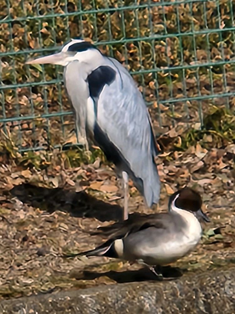 灰色のアオサギが🌿小さなオナガガモが揺れる春の静けさ!