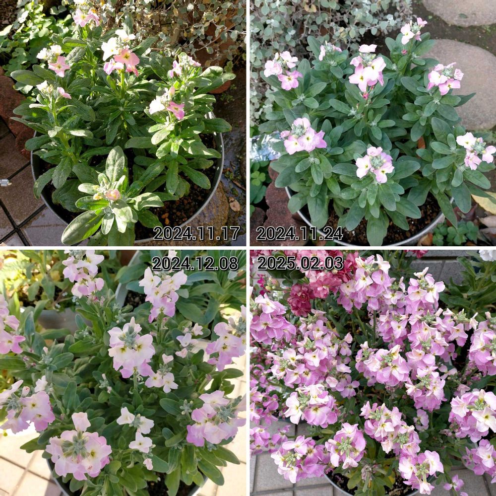 【1枚目】矮性スプレー咲きストック・ベイビーレインボーの一重花をまとめて植えたプランターも満開です!😆 もう種さやも付いてるから満開は過ぎちゃったかな。