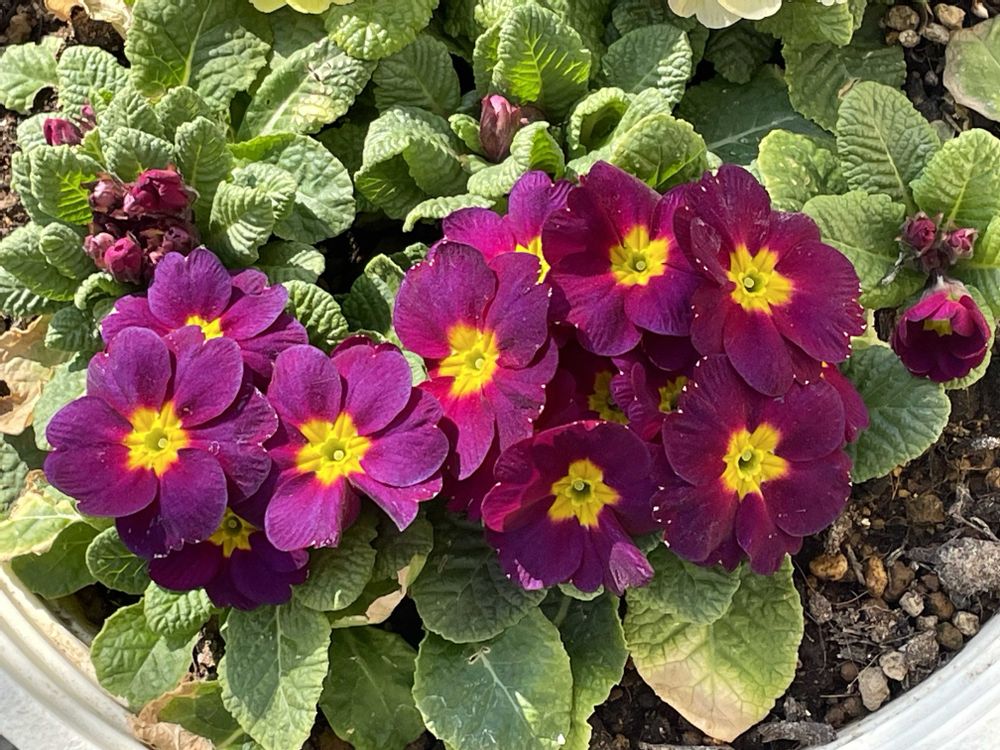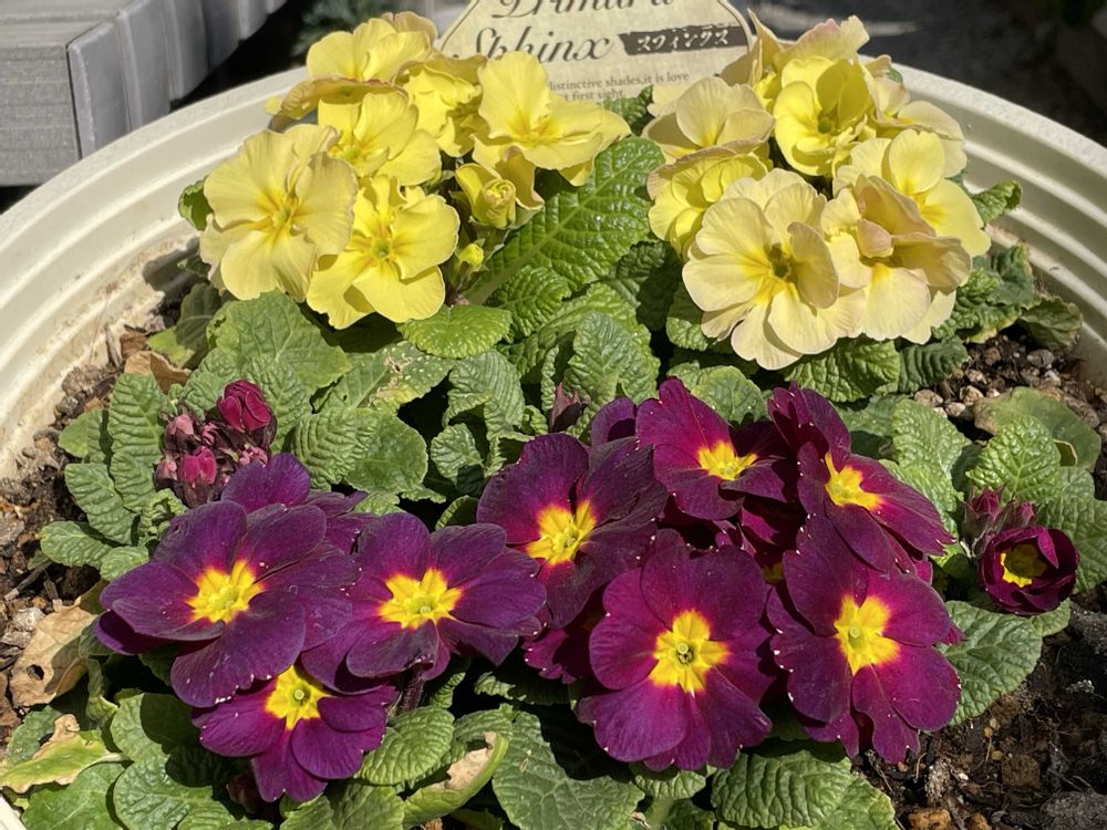 ウチのプリムラさんは、夜間は玄関に入れて、日中は軒下でお日様に当たっています☀️