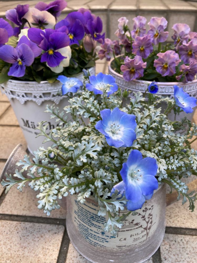 素敵なブリキ鉢にビオラ・ひとつぶの涙と夢見るパンジー そしてネモフィラを入れてみました💙💜🩷
