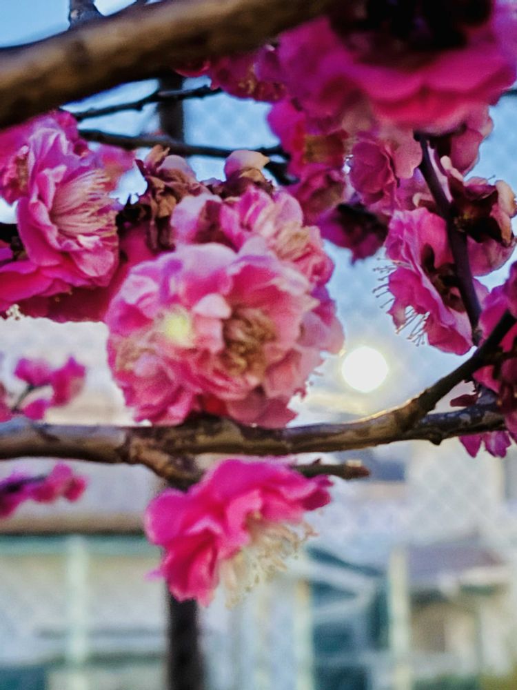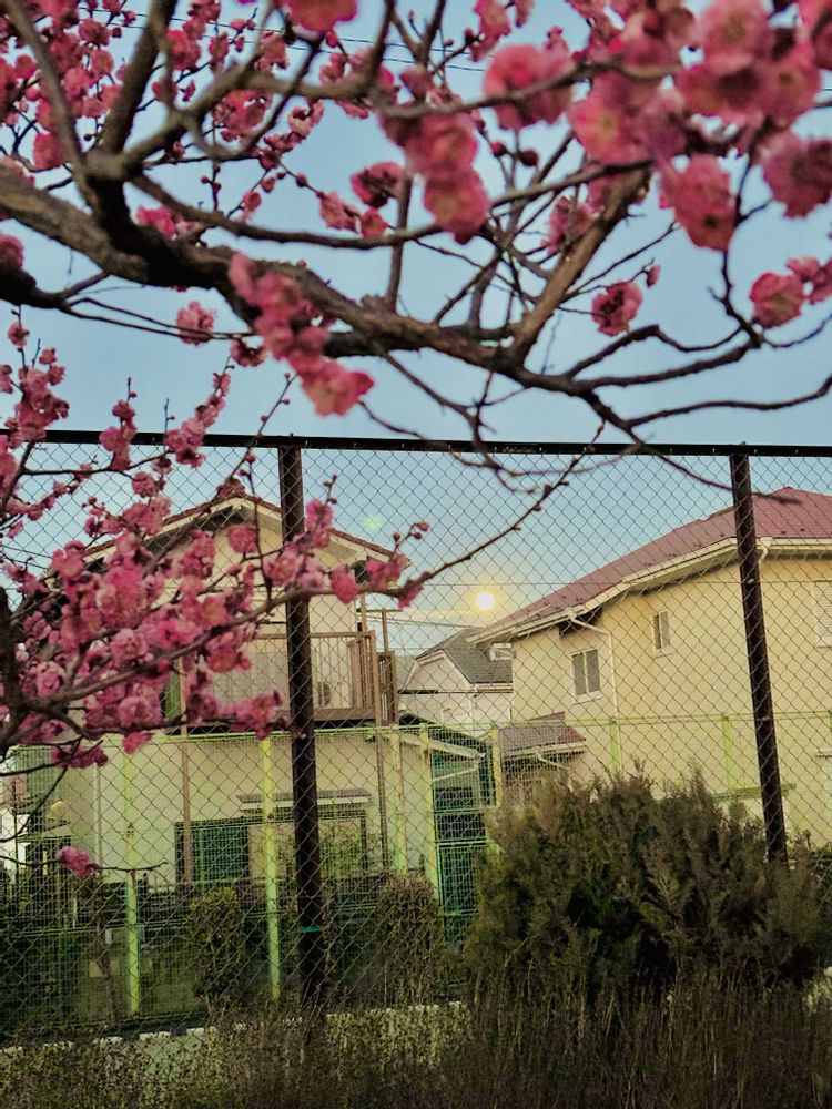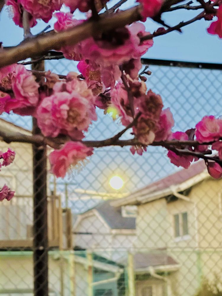 マンションの八重咲きの紅梅と、上ってきたばかりの明るいお月様をパチリ🌕✨