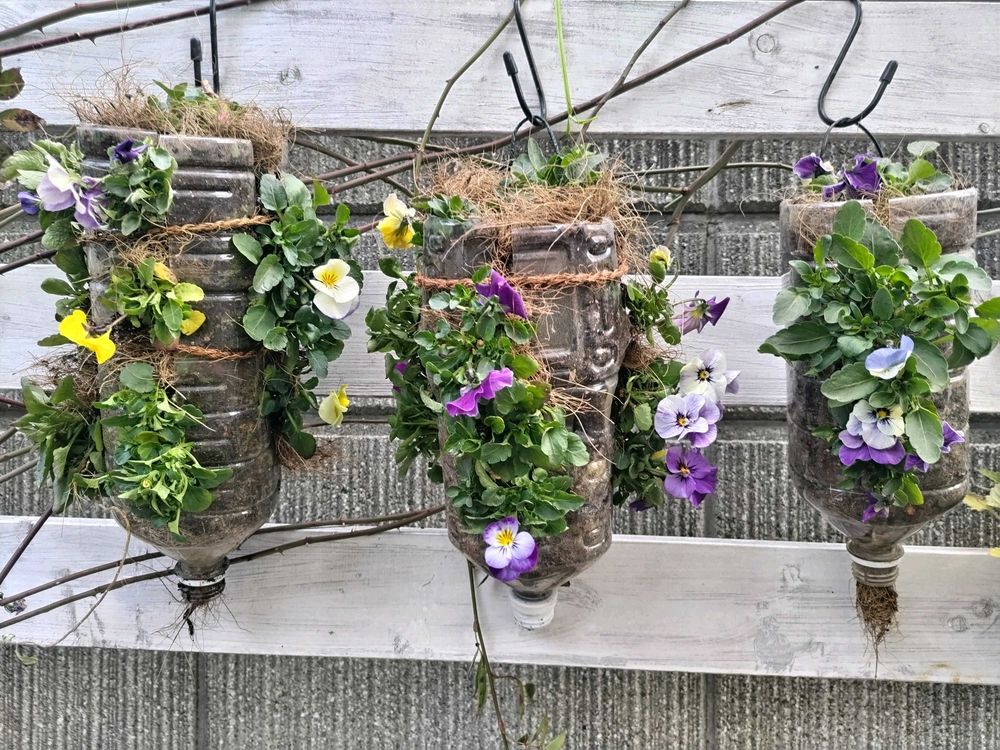 昨年作ったペットボトルがあったので種蒔きからのビオラを植えた。作りたてなのでしっくりとはいきませんが。