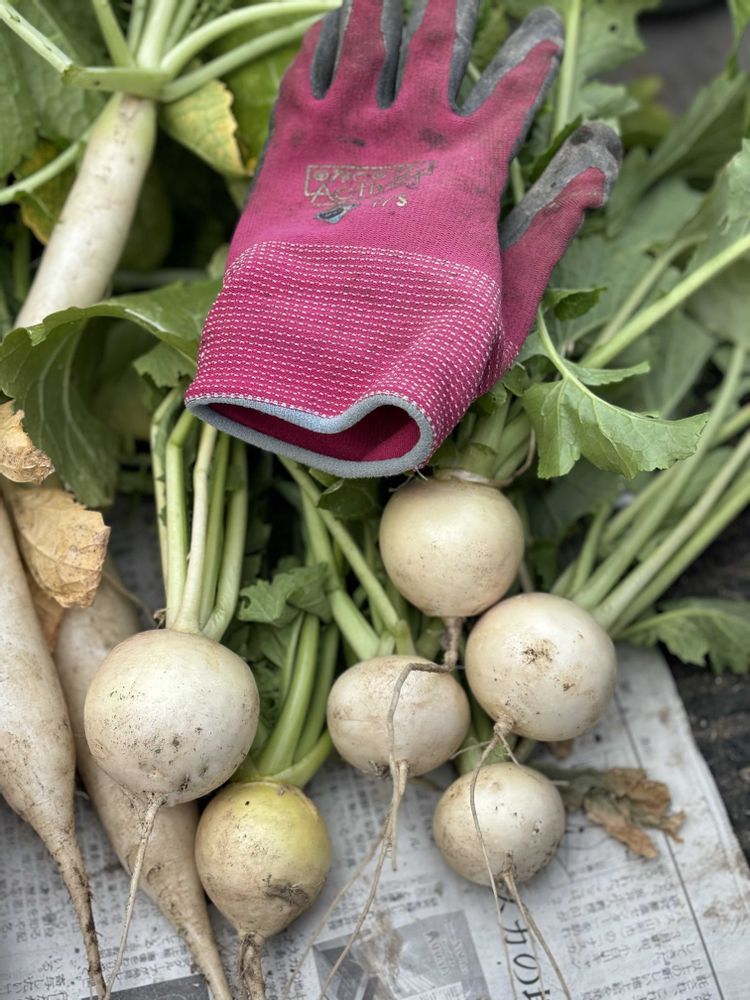 おはようございます( .ˬ. )宮重大根🌿と金町小蕪🌱収穫しました(*ˊ˘ˋ*)⤴️ ぼちぼち…成長してる✨️大きさ比較の為…汚い手袋💦ごめんなさい😓宮重大根は細いイメージね‼️火の通りははやいと思うから時短にはなるね😊