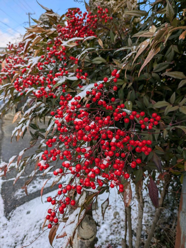 散歩道、目に飛び込んでくるのは南天の実の赤。