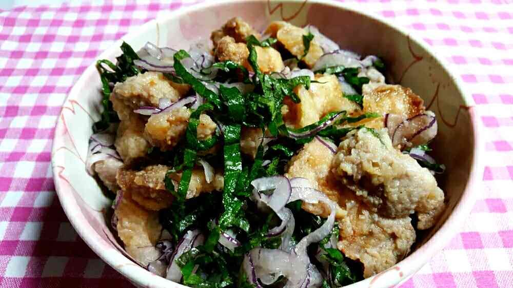 豚バラブロック素揚げと赤玉ねぎスライスと大葉たっぷりを塩コショウ少々で和えたやつ!