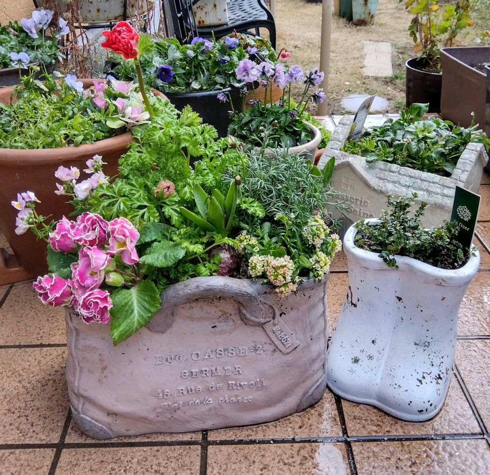 カバン👜の鉢から溢れるように植えたプリムラが良い雰囲気ですねー💓