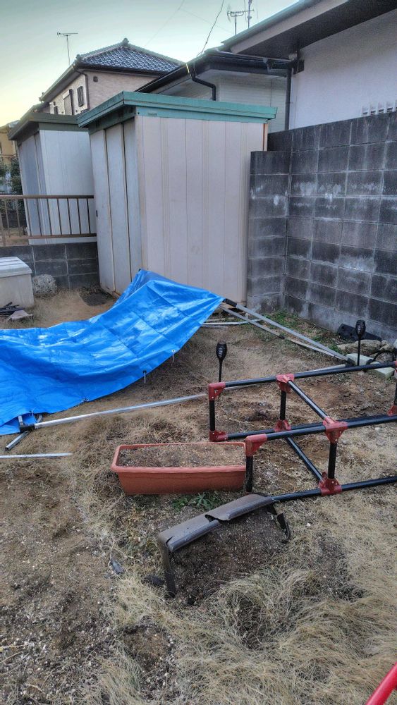 サイクルハウス、レジャーシートを外して、骨組を起こしてみたら横に倒れただけみたいで、外れたパイプを取り付けしたらなんとか使えそうなので、よけいな出費はまぬがれたみたい😉