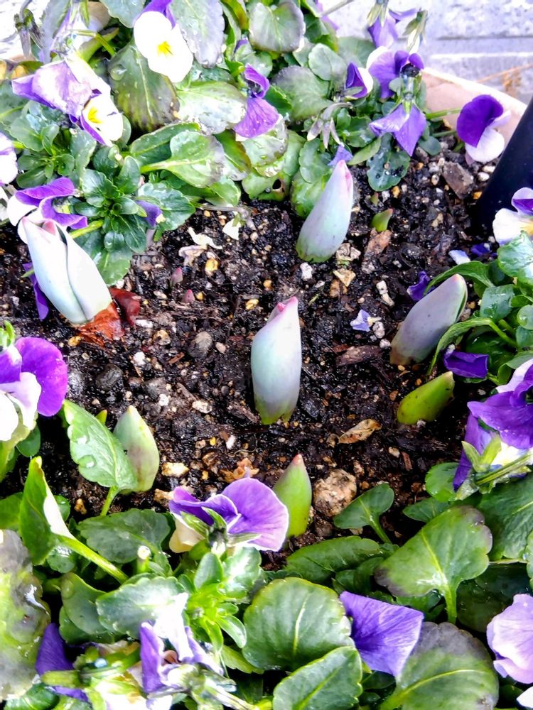 ガチガチに凍ったビオラの真ん中からチューリップが芽を出してきましたよ〜*.(๓´͈ ˘ `͈๓).*