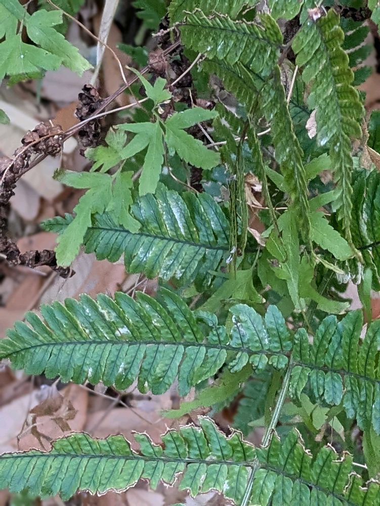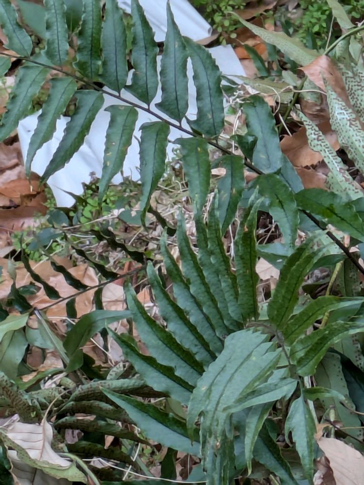 ①ベニシダオシダ科 オシダ属 紫金山公園で 本州から九州の森林や路傍で普通にみられる常緑シダ植物。葉の先端は尖りません。飯盛山で見たのもこれでした。