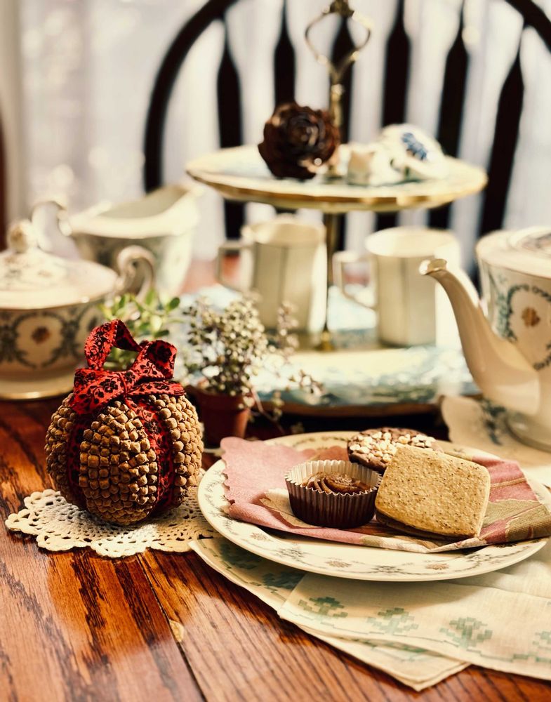 オレンジポマンダー、可愛いリボン🎀🎀それも小さい頃に使っていたリボンとは💕💕オレンジポマンダー🍊の雰囲気にあい、そして、ティーセットも古き良き昔を思い出させ、ノスタルジックな空間ステキです💠💠