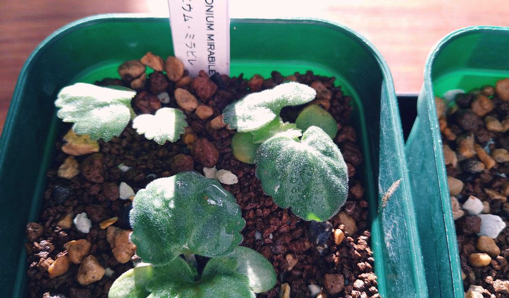 1月播種のペラルゴニウム。トリステは2週間遅れ。ミラビレとトリステの葉ってってこんなに違うんだね。