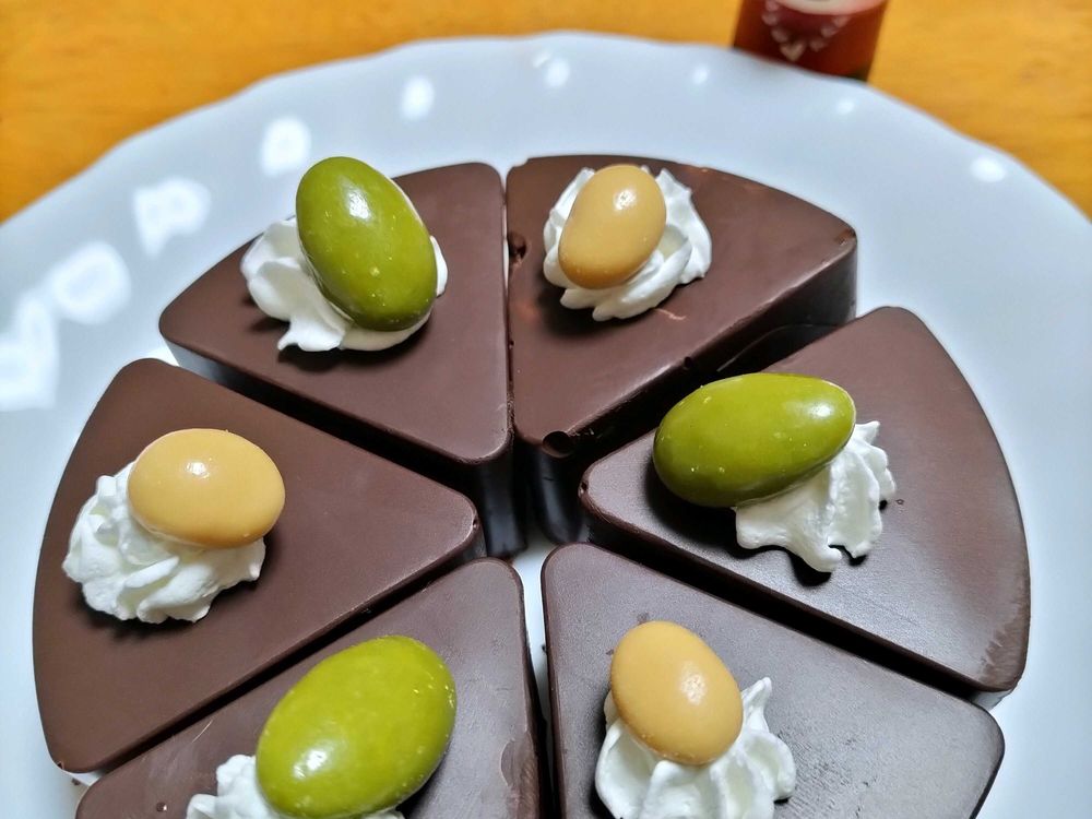 ミニケーキ型シリコンでチョコを流し側面にもつけて固まらせて、中は砕いたオレオもどきにホイップを混ぜてチョコに詰め上にチョコで蓋をしてまた固めて完成✌️